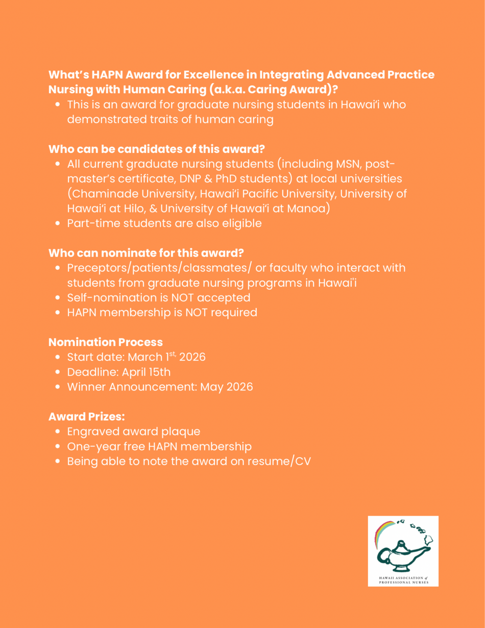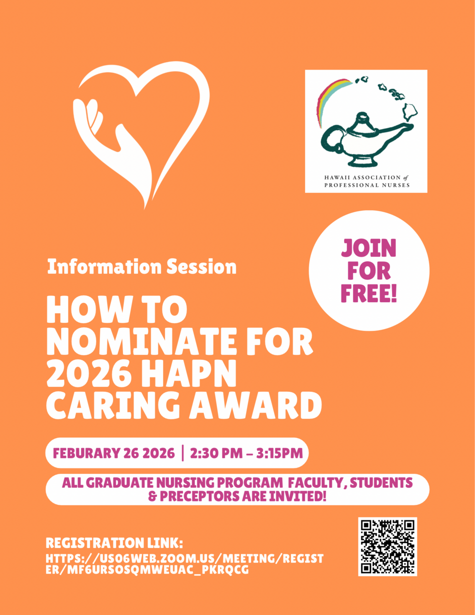 The Hawaiʻi Association of Professional Nurses has created a new award for graduate nursing students in Hawaiʻi and would like to invite you to an information session about how to nominate students for this award.